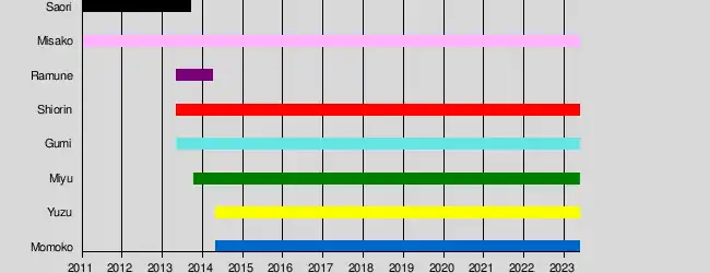 On May 7, 2013, the two members held a livestream announcing the addition of three new members: Ramune Mizutama, Ringo Koishio, and Gumi Nanase. Their official introduction as a five-person group was at the live performance on June 8 of that same year.