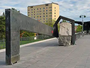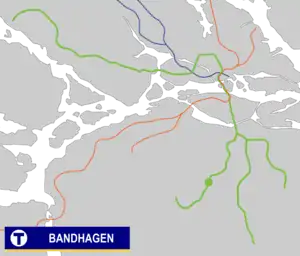 Bandhagen metro station is on the Green line of the Stockholm metro, located in Bandhagen, Söderort. The station was inaugurated on 22 November 1954 as part of the extension from Stureby to Högdalen.[2] The distance to Slussen is 6.5 km.