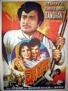 Bandhan (English translation: "tie" or "bond") is a 1969[1] Hindi film directed by Narendra Bedi, starring Rajesh Khanna and Mumtaz. It was Bedi's directorial debut[2] and the second movie with Khanna and Mumtaz together in the lead roles. The film grossed ₹2.80 crore at the box office in 1969–70.[3] Khanna's songs were performed by the playback singer Mahendra Kapoor. This film is counted among the 17 consecutive hit films of Rajesh Khanna between 1969 and 1971, by adding the two-hero films Marayada and Andaz to the 15 solo hits he starred in over these three years.[4]