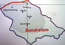 Bordered on the West and South-West by Bangoua, on the North by Batoufam and on the East by Bagang-Fokam, Bandrefam covers an area of about 17 square km divided in six districts : Ngouonkouong, Nka’ala, Pou’guieu, Tchieu, Toula et Ntchi.