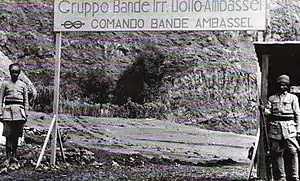 Locally recruited bands were employed in the conquest of Italian Libya from 1911 to the 1930s. Their Somali counterparts played an important role in Italian Somaliland during the 1920s.[2] In Italian Somaliland, the Italians also employed Dubats; levies that were maintained on a permanent basis and were better trained and equipped than the Banda. During the guerrilla war that continued in Ethiopia after the 1936 Italian invasion, Bande were recruited amongst groups collaborating with the Italian regime. One of the best known of these was the Gruppo Bande irregolari "Uollo Ambassel" in northern Ethiopia.
