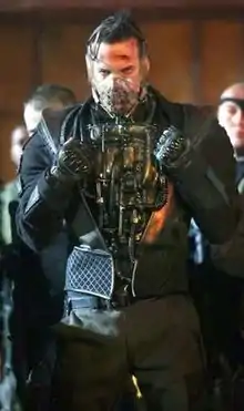 Bane appears in The Dark Knight Rises, portrayed by Tom Hardy.[8][9][10] Intending to portray the character as "more menacing" than the Batman & Robin incarnation, Hardy gained 14 kilograms (31 lb) of muscle for the role,[11][12] increasing his weight to 90 kilograms (200 lb).[11] Prior to the film's release, Bane's voice received some criticism for being unintelligible due to his mask. Speaking to Entertainment Weekly, Christopher Nolan said "I think when people see the film, things will come into focus. Bane is very complex and very interesting and when people see the finished film people will be very entertained by him."[13] "We wanted a very physical monster. We wanted more of the Darth Vader, if you like, and that was very important in the story dynamics."[14] Hardy himself also commented on the voice in another interview with Entertainment Weekly, saying "It’s a risk, because we could be laughed at—or it could be very fresh and exciting", and that "The audience mustn’t be too concerned about the mumbly voice... As the film progresses, I think you’ll be able to tune to its setting." Hardy says the voice he developed had several influences, including Bane's intellect, Caribbean heritage,[15] and in particular, bare-knuckle fighter Bartley Gorman.[16][17]