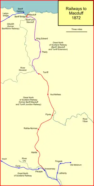 As the scheme was developed it became obvious that available finance would enable the line to be built only as far as Turriff, a distance of 18 miles, forming a junction with the GNoSR at Inveramsay.[note 1] It was submitted to the 1855 session of Parliament; the GNoSR agreed to take £40,000 of shares in the new company, and to work it for 50% of gross receipts. The Banff, Macduff and Turriff Junction Railway was authorised by Parliament on 15 June 1855, with capital of £120,000.[3][4][5][2][6]