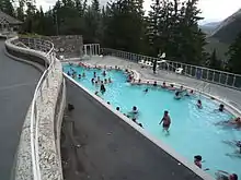 Prior to the 1880s, the Indigenous Peoples first found and used the hot springs.[1] They used it for healing and wellness. In 1883 the hot springs were discovered by workers working on the Canadian Pacific Railway. This discovery led to the development of Banff National Park.[4] Planning for hot springs facilities in western Canada started in 1884 with the visits of the Europeans to Canada.[5] Hot springs were popular in European countries at this time such as Bath, which is located in England and known for its natural hot springs. These European trends had an influence on the design and development of Canadian hot springs. Originally all Banff hot springs were a privately owned entity; however when the Canadian Government purchased the land to create Banff National Park in 1885, they took over ownership of the hot springs since it was now located on their land. The first construction of the site was in 1886. The first development was a building called the Grand View Villa and a log bathhouse.[5] With the expansion of the Canadian Pacific Railway in 1888, the popularity increased. The government started to create roads and paths to make it easier for tourists to travel to the area.[6] In 1915 the Upper Hot Springs road was opened to motorists and now tourists could drive up to the site.[4] In 1931 the Banff Upper Hot Springs bathhouse was declared a Registered Federal Heritage Building by the Government of Canada.[4] Since then it has gone under many renovations to make it one of the most popular hot springs in its region, hosting to over 300,000 visitors annually.[7]