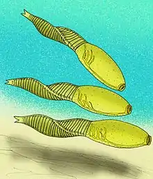 There is no agreement on the classification of Banffia. B. constricta was assigned to the annelids by Walcott in 1911.[3] As of 2006, different proposals would place Banffia in Vetulicolia,[1][4] Arthropoda,[2] or Urochordata. While the body plan (equal anterior and posterior sections with segmentation) resembles that of the Vetulicolians, it is argued that the absence of gills and an endostyle, and the presence of gut diverticula makes Banffia unlikely to be a member of the deuterostomes. However, an apparent complete lack of appendages (aside from the antenna-like structures) makes B. constricta's placement within Arthropoda equally unlikely. More recent finds of similarly shaped animals show structures thought to be a notochord, making Banffia and their relatives chordates, possibly the sister group to tunicates.[5]