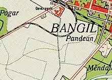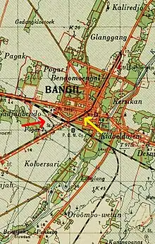 To the south of the station, behind an abandoned locomotive depot there was branch connected to Pandaan and Japanan operated by a private tramway company named Modjokerto Stoomtram Maatschappij (MdjSM) or Mojokerto Steam Tramway as for Bangil-Japanan-Mojokerto rail line which opened on May 4, 1919. The line itself was used for the freight route and along this line, there were Panda'an (Ardiredjo) and Japanan sugar mills. Actually, this line was a displacement railway line for MdjSM from the first line which was inaugurated on September 18, 1899.[10] The first MdjSM line used this station from track no.1 to the east (to Pasuruan) and then curved to the south passing behind the prison. Then, around 1914 Staatsspoorwegen (SS) proposed a line construction using the actual Modjokerto tramway's line map to the north (Kaliredjo) which connected to Sumberredjo sugar mill as a freight route service and this also impacted the operation of MdjSM's asset with the move of their railway line. The move of MdjSM railway line to the south because the line to Sumberredjo was actually belonged to MdjSM as part of Panda'an-Bangil line based on Colonial Government's Decree No.1 on 31 of December 1895. After line to Panda'an finished and opened in 1899, the MdjSM didn't execute the line construction to the north (Kaliredjo) which connected to the sugar mill and they considered it less profitable for their business operations. Finally, this line was taken over by State Railway or Staatsspoorwegen to built it which started from track number one from this station connected to Sumberredjo passing Bangil town square (just north from the station) around 1914-16 and finished in 1919.[11]
