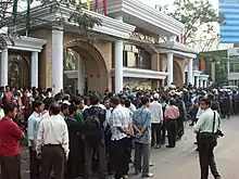 The Bangladesh Rifles revolt (also referred to as the Pilkhana tragedy) was a mutiny staged on 25 and 26 February 2009 in Dhaka by a section of the Bangladesh Rifles (BDR), a paramilitary force mainly tasked with guarding the borders of Bangladesh. The rebelling BDR soldiers took over the BDR headquarters in Pilkhana, killing BDR director-general Shakil Ahmed along with 56 other army officers and 17 civilians. They also fired on civilians, held many of their officers and their families hostage, vandalised property and looted valuables . By the second day, unrest had spread to 12 other towns and cities.[5][6] The mutiny ended as the mutineers surrendered their arms and released the hostages[7] after a series of discussions and negotiations with the government.[8] Prime Minister Sheikh Hasina, who returned to office less than two months before the revolt, was widely praised domestically and internationally for her handling of the mutiny, however some criticised her for not ordering an armed raid of the BDR Rifles compound. The Daily Star commended "her sagacious handling of the situation which resulted in the prevention of a further bloodbath".[9][10][11]