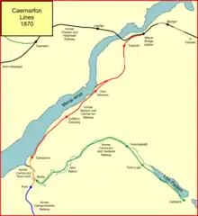 Caernarfon (then spelt Carnarvon) was an established regional centre, and a rail connection had long been considered. The Chester and Holyhead Railway had contemplated building a branch line, but in fact it was a private scheme which gained support, to Port Dinorwic only at first. The Bangor and Carnarvon Railway was authorised on 20 May 1851.[2] Its Act permitted the Chester and Holyhead Railway to work the line. It was to make a junction with the C&HR main line at a junction a little east of Britannia Bridge.[3][4]