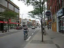 Between Wellington Street and Gladstone Avenue in downtown, Bank Street is a shopping and business development district officially known as the "Bank Street Promenade" and the street is lined with common signage affixed to streetlights and street-level advertising billboards showing this distinction.