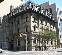 The first Toronto branch, designed by John George Howard was built in 1845, with exterior work by John Cochrane and Brothers,[5] at the northeast corner of Yonge Street and Wellington. The current building, designed by architect Henry Langley, replaced the original in 1875.[6] A restaurant occupies the ground floor with offices above.