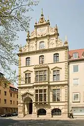 In 1880/81 the banker, Alfred Löbbecke, had the Braunschweig architect Constantin Uhde and the garden architect Friedrich Kreiß build a villa on Inselwall[4] (Löbbecke's Island), which was destroyed in 1944 and after reconstruction from 1968 to 2008 housed the guest house of the Technical University of Braunschweig.[5] The building, which has since been vacant, was sold by the Braunschweig University Association to the Braunschweig investor Klaus Gattermann for €700,000 in 2009 and has been used commercially since 2011. The current bank building in Braunschweig was also erected by Uhde in 1892.