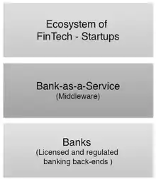 Skinner suggested a 3-layer representation of the BaaS stack.[3] In this stack, the underlying infrastructure-as-a-service is provided by a traditional, licensed and regulated bank. Above this bank would be the centralized Middleware layer that Skinner refers to as "bank as a service". Added on to the bank as a service is a group of decomposed banking services consisting of an ecosystem of FinTech startups and service providers.
