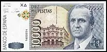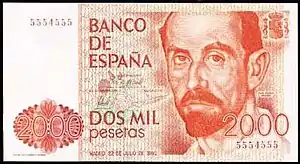 The banknotes of the Spanish peseta were emitted by the Bank of Spain in 1874–2001 until the introduction of the euro. From 1940 the banknotes were produced by the Royal Mint (Fábrica Nacional de Moneda y Timbre). In about the same year the inscription "El Banco de España" on both sides of the banknotes was temporarily changed to "Banco de España", as the definite article "el" was dropped.[1] There is no significant legislation on the copyright of the Spanish peseta banknotes and their reproductions are permitted, except for advertising.[2]