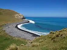 Le Bons Bay has a large often empty beach. There is a small settlement of holiday houses. It is surrounded by rolling hills. A river empties into the sea where New Zealand Fur Seals often frolic.[32] First known as Bones bay in 1845, it became known as Le Bons Bay. It is suggested that this was either that a French settler named Le Bon lived there, or that early French settlers called it "The good bay" or that it is a corruption of Bones bay.[33]