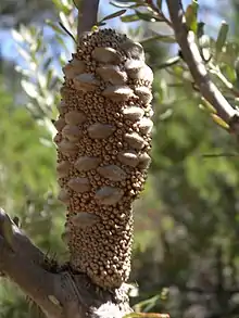 - The Kybean Range form, in southeastern New South Wales – located in the Kybean Range and Tuross River east of Cooma.[7] The Snowy River separates this form from the Wulgulmerang form to the west.[22] This form has the largest flower spikes and infructescences,[23] measuring up to 14 cm (5.5 in) high and 6 cm (2.4 in) wide.[24] It has very short adult leaves, yet wide juvenile leaves that resemble Banksia integrifolia.[23]