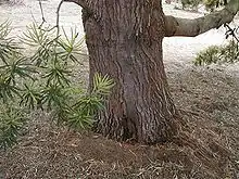 The river banksia generally grows as a tree up to 25 metres (80 ft) tall with a usually brown to grey trunk covered with a hard grey furrowed bark.[3] The tree trunk is often straight and tall as the species generally grows in sheltered forest areas. The leaves are arranged on the stems in whorls. Measuring 5–12 centimetres (2–4+3⁄4 in) long and 1–1.8 centimetres (1⁄2–3⁄4 in) across, they are linear in shape with serrated margins. The upper leaf surface is finely furred becoming smooth, while the undersurface is covered in white fur.[3]