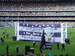 One of the first of the longer banners to traverse quite some length of the fence was at the 1962 VFL Grand Final. It read, "Come on Carlton - The Mighty Blues", behind which sat the Carlton Cheer Squad.[3] Cheer Squads, typically, made these longer banners and during 1963 most clubs’ cheer squads had created lengthy banners for mounting to the fence for their club's games. Sometimes, during VFL finals, banners of a non-competing team may appear, often because the club may have had a reserves team competing in an earlier game on the day. An example of this is a prominently mounted Collingwood banner during the 1966 Essendon v St Kilda VFL Preliminary Final.