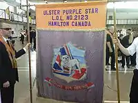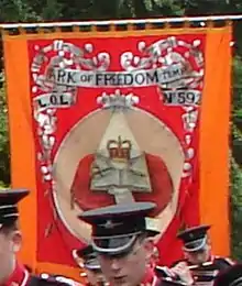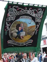 Banners are a significant part of the Culture of Northern Ireland, particularly for the Protestant/unionist community, and one of the region's most prominent types of folk art. They are typically carried in parades such as those held on the Twelfth of July, Saint Patrick's Day and other times throughout the year. Generally these are organised by societies such as the Orange Order, the Ancient Order of Hibernians, the Royal Black Institution and the Apprentice Boys of Derry, and the banners are typically commissioned by, and represent, a lodge within one of these societies. Banners are also carried by trade unions and church groups, and by marching bands. Most banners are painted by professionals and executed on silk, although canvas was a more popular material in the past. Most have a painting on each side, usually depicting different subjects, and the name and number of the lodge. Most banners have one subject per side, surrounded by flourishes, scrolls, and other decoration. Despite being in many ways a sectarian art form, Catholic and Protestant banners are usually very similar in terms of style and composition. Apart from subject matter, the main difference is colour: Orange Order banners make heavy use of the colour orange and to a lesser extent red, white, blue and purple, while Catholic banners tend to feature a lot of green.
