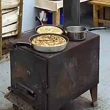 The bannock of many pre-contact American peoples was made of corn and nut meal, and flour made from various roots and ground plant bulbs, and sweetened with syrup from trees.[12] There were many regional variations of bannock that included different types of flour, and the addition of dried or fresh fruit.[12] The method of cooking was similarly diverse. Some rolled the dough in sand then pit-cooked it. When completed, the sand was brushed off and then the bread was consumed. Other groups baked the bannock in clay or rock ovens. while some wrapped the dough around a green, hardwood stick and toasted it over an open fire.[12] Bannock's functionality made it viable to cook and consume while conducting daily activities at home, or hunting, trapping, fishing, and gathering out on the land.[11]