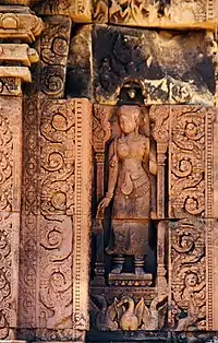 The temple's modern name, Bantãy Srĕi—citadel of the women, or citadel of beauty—is probably related to the intricacy of the bas relief carvings found on the walls and the tiny dimensions of the buildings themselves.[8] Some have speculated that it relates to the many devatas carved into the walls of the buildings.[9]