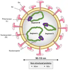 Phenuiviridae is a negative-sense single-stranded RNA virus family.[4] Its genome is segmented into three pieces: L segment (encoding RNA-dependent RNA polymerase), M segment, and S segment.[1]