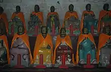 The settlement is completely encircled by a fortified stone wall, much like Chengde Mountain Resort. The main entrance is Nantianmen (南天门; 南天門; 'Southern Heavenly Gate'). Inside the wall there are several important cultural sites, which have earned Baodu Zhai a national AAAA rating as a scenic spot, as well as a large area of vegetation and gardens. These sites include the Hall of 500 Luohan, which is a large underground chamber containing 500 carved stone luohan, each in a different pose, and presided over by three golden Buddhas.