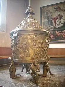 The Bronze baptismal font (German: Bronzetaufe) in the Hildesheim Cathedral is a late Romanesque baptismal font which was probably made in Hildesheim in the first third of the thirteenth century. It is noted for its pictorial decoration which is of the highest quality and for its perfect proportions and is considered among the most outstanding works of its type. For centuries the baptismal font stood in the western part of the nave, until it was moved to the last of the northern side-chapels (George's chapel) in 1653. During the ongoing renovations of the cathedral (2010–2014) it is being displayed in the Bode Museum in Berlin.[1] After the completion of the renovation work, it will be placed in the centre of the nave under the Hezilo chandelier.