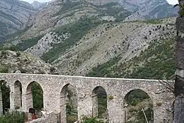 The Bar Aqueduct (Montenegrin: Барски аквадукт, romanized: Barski akvadukt) is a stone aqueduct located on the northern side of Stari Bar Fortress, 4 km north of the town of Bar in Montenegro. The Bar Aqueduct is the only remaining aqueduct in Montenegro, and one of the largest and best preserved aqueducts from the three remaining ones in the former Yugoslavia, which include the Diocletianus Aqueduct near Split, Croatia and the Skopje Aqueduct in North Macedonia.