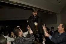 Bar mitzvah festivities typically include a joyous seudat mitzvah, a celebratory meal with family, friends, and members of the community, the bar mitzvah boy delivering on this occasion a learned discourse or oration at the table before the invited guests, who offer him presents, while the rabbi or teacher gives him his blessing, accompanying it at times with an address.[15] Some Jews celebrate in other ways such as taking the bat or bar mitzvah on a special trip or organizing some special event in the celebrant's honour. In many communities, the celebrant is given a certificate. According to the Orthodox view, the bar mitzvah boy is so happy to be commanded to do mitzvot and earn a reward in the next world for his efforts, that he throws a party and has a festive meal.