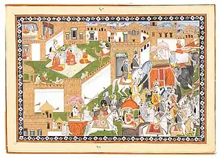 In Dogra tradition, baraat is organized with great pomp and show. It is also known as Janjh in Dogri. When the groom gets ready, he is adorned with Sehra by his maternal uncle. This is known as Sehrabandhi. After this, Ghodi-chadha takes place where groom rides the horse with sword in his hand. The horse is offered fooder and chana dal. The sisters of groom adorn groom with necklaces of gold or silver or even currency notes. Dogri folk songs called ghodia are sung.[8] And sisters in law apply kajal on groom's eyes. Dhol and musical instruments are played and the family members and friends of groom dance in joy. The baraat halts temporarily at local Mandir for darshan. This ceremony is called Dev Karaj. In older times, when baraat used to travel long distances, then women of household used to stay at home. They would celebrate the marriage by performing Jagarna dance. When the baraat reaches wedding venue, fireworks are displayed. The groom is welcomed by his mother in law by applying tilak & aarti and offering him sweets and Dogra dish Suchi. After this, the ceremony of Milini takes place. Relatives of both groom and bride meet and exchange gifts. Ladies from bride’s side, sing the special song called sidnya (humorous song). After completion of wedding rituals, the baraat headed by groom brings bride to home.
