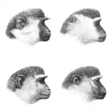 | Chlorocebus head color patterns Top left: green monkey, top right: grivet Bottom left: malbrouck, bottom right: vervet | |