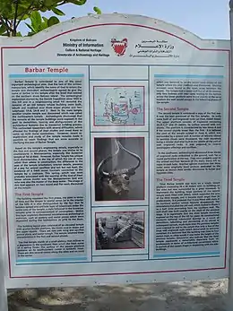 The Barbar Temple is an archaeological site located in the village of Barbar, Bahrain, considered to be part of the Dilmun culture. The most recent of the three Barbar temples was rediscovered by a Danish archaeological team in 1954. A further two temples were discovered on the site with the oldest dating back to 3000 BC. The temples were built of limestone blocks, believed to have been carved out from Jidda Island.[1]