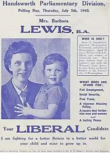 She continued her activity in the party and was elected a member of the Liberal Party national executive. She was also involved in party policy development being a joint author of the Liberal report The Aged and the Nation.[3] She did not contest the 1950 General Election. She was Liberal candidate for the Walsall division of Staffordshire at the 1951 General Election;