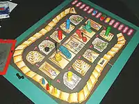 The game is played on a circular board, with three tracks running around it. Around the outside are the scoring track and the elfstone (money) track. Further in there is a circular track with twelve marked spaces on it, and in the center there is a space for sculptures. Later editions of the game change the shape of the board but not its contents.