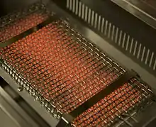 Infrared grills work by igniting a gas fuel to heat a ceramic tile, causing it to emit infrared radiation by which the food is cooked. The thermal radiation is generated when heat from the movement of charged particles within atoms is converted to electromagnetic radiation in the infrared heat frequency range. Infrared grills allow users to more easily adjust cooking temperature than charcoal grills, and are usually able to reach higher temperatures than standard gas grills, making them popular for searing items quickly.[12]