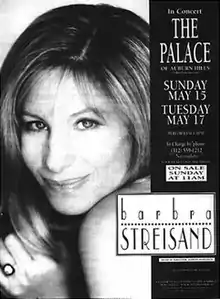 Barbra Streisand in Concert is Barbra Streisand's first full tour which ran from 1993 through 1994. The tour consisted of 26 shows starting on New Year's Eve 1993 in Las Vegas and ended Anaheim, California in July 1994. The 18 shows that went on sale following the new year concerts in Las Vegas sold out in 1 hour.[2] This tour was also the first time Barbra toured anywhere in Europe and was the last until her Timeless tour in 2000.