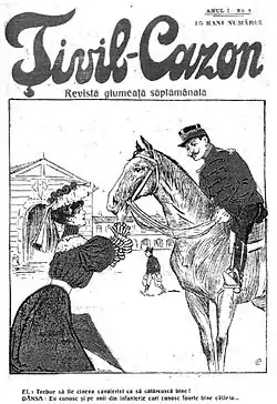 In 1906, Lăzăreanu founded the satirical weekly Țivil-Cazon ("Civilian-Conscript"),[26] for which he used the pseudonym "Bélé".[4] The magazine hosted the work of Ioachim Botez, Ioan Dragomirescu-Dragion, Leon Wechsler-Vero, and Victor Eftimiu,[27] who was also a pseudonymous co-editor. Eftimiu and Lăzăreanu's work for it included rhyming quatrains that parodied or mocked the more serious literary reviews.[28] Eftimiu noted, years later, that Bélé was "very talented".[29] Țivil-Cazon became the first Romanian journal of its kind to feature colored prints, and included artwork by Iosif Iser, Nicolae Petrescu Găină, and Nicolae Mantu. Heavily inspired by Ion Luca Caragiale and his Moftul Român, it mainly targeted Romanian Army personnel, depicted as slow-witted and (especially if cavalry officers) as sex objects.[30]