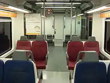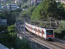 Before the entry into service of the 113 and 114 Series throughout 2014, a former 20-unit set of the three-car 111 Series trains had run on the line. These trains started operating between 1983 and 1987, and were the line's first modern electrical multiple units.[41] From January 2014 on, a 19-unit set of the four-car 113 Series trains progressively started operating on the Sabadell, Terrassa and Reina Elisenda branches together with the 112 Series.[42] In December of the same year, a 5-unit set of the three-car 114 Series trains started operating on the Avinguda Tibidabo branch, whose station platforms are too short to hold four-car trains such as the 112 and 113 Series.[43] The 113 and 114 Series are identical in both their technical features and design, though they differ in the number of cars and present some modifications on the seat layout.[35] After the arrival of the 113 and 114 Series, 111 Series trains were removed from circulation and dismantled. Yet, one unit has been preserved as part of FGC's historical rolling stock.[44]