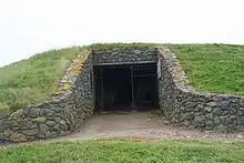 Barclodiad y Gawres (Welsh for "The Giantess's Apronful") is a Neolithic burial chamber between Rhosneigr and Aberffraw on the south-western coast of the island of Anglesey in North Wales. It is an example of a cruciform passage grave, a notable feature being its decorated stones. Similar graves and marks exist across the Irish Sea in the Boyne Valley.[1]