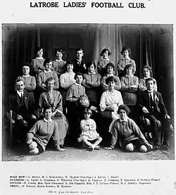 The Latrobe club has the distinction of having formed one of the earliest known women's teams in Australian football history: the Latrobe Ladies’ Football Club, in 1921 (see photograph at right). The club played 'friendly' matches in the newly formed Queensland Ladies Soccer Football Association, which included two other clubs, North Brisbane and South Brisbane. Remarkably, about 10,000 spectators attended at the Brisbane Cricket Ground in late 1921 to watch a ladies' match (between North Brisbane and South Brisbane).[62] The annual meeting of the association in 1922 expressed the desire to commence regular fixtures during the forthcoming season with "about half a dozen teams".[63] The new season commenced in June of that year with a match at Bowman Park (see below). However, there are no known records of the progress of this association after the 1922 season.