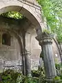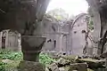 The complex consists of two churches, a vestibule, a chapel, the ancestral cemetery of Mamikonyan and remainders of khachkars.[3] The two churches and the vestibule that make the main group are placed near to each other in one line. The preserved oldest construction, built of rough-hewn smaller basalt stones is the one-nave hall type church at the north of the complex, of which only a 3-4m high wall remains. Although no details have reached us about the history of this church, from the construction methods it is thought to have been built in the 10th century. The building in the center is the 13th century Holy Astvatsatsin - the main church, of which the entrance, parts of the southern and western walls, sections of flying arches, and pillars are still well preserved. Holy Astvatsatsin and it's gavit are both constructed of large, finely cut slabs of felsite stone. The monastery does not appear to have functioned for long after the construction of Holy Astvatsatsin, as the last of the inscriptions on the church walls date to the mid-13th century.[3]
