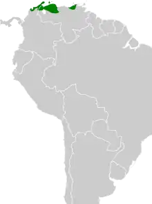 The bare-eyed pigeon is found on the Caribbean coasts of Colombia and Venezuela and the near-shore islands of Aruba, Curaçao, Bonaire, Margarita, and Blanquilla. It primarily inhabits an arid landscape of thorn scrub, cactus, and acacia and is also found in mangroves and cultivated areas. It can be found as high as 400 m (1,300 ft) above sea level on the mainland but is generally much lower.[4]