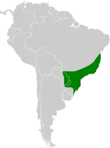 The bare-throated bellbird is native to Brazil, Paraguay and Argentina.[1] Whereas it is common in the former two countries, it is rare in Argentina. In 2017, less than 250 mature individuals were estimated to exist in Argentina.[4]