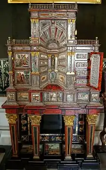 In cabinetry, the bargueño (or vargueño, both pronounced [baɾˈɣeɲo]; meaning "from Bargas") is a form of portable desk, made up of two chests, the bottom one usually having drawers (called a taquillón) and the top one having a hinged desk surface which also serves as a side-mounted lid. It is basically a chest or box with one of the side panels, rather than the top panel, serving as a fold-out writing surface. The interior of the desk is equipped with small drawers, pigeonholes, etc., for storing papers and supplies. The bargueño has also been used for sewing or as a jewel chest.