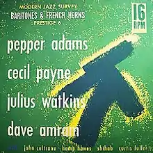 Baritones and French Horns is a 16+2⁄3 rpm album released in August 1958 by Prestige Records.[1] The album is one of a series of releases attributed to the Prestige All Stars.[2] Each side of the album was a distinct date with distinct personnel. From a jazz.com review,[3] Kenny Berger wrote, "Among the many innovative technological failures of the mid- and late- 1950s, the 16-rpm phonograph record stands as the industry's answer to the Edsel. One of Prestige's contributions to this auditory dustbin was an LP on steroids titled Baritones and French Horns under the supervision of vibist, composer, arranger, A&R man Teddy Charles. The baritone side of this album was reissued twice on LP and twice more on CD under John Coltrane's name [as Dakar], though Pepper Adams was the actual leader on these sessions." The "french horns" side of the album was reissued as Prestige ST 8305, Curtis Fuller and Hampton Hawes with French Horns.[4]