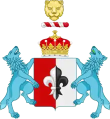 ![]() Arms: Per pale Gules and Argent, a Fleur-de-lis per pale Argent and Sable. Crest: A Leopard’s Face Or. Supporters: On either side a Wolf Azure. | |