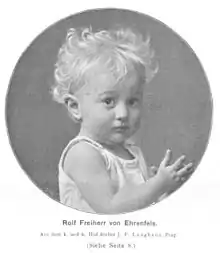 Rolf Ehrenfels was an Austrian citizen all his life. Lichtenau near Krems and Gföhl in Lower Austria was his home parish. Since 1813 the Ehrenfels family were settled in Schloss Lichtenau. Also the castles Brunn im Walde and Rastbach were family properties. Rolf's eldest sister "Elfi" Elfriede Hartmann married a widower with three children and had her own home from the early 1920s. His sister Imma Ehrenfels married Wilhelm "Willy" (von) Bodmershof (Schuster) and they settled at Rastbach castle for life. In 1925 there was a double wedding as Rolf Ehrenfels married Willy's sister Fridl who became Elfriede Ehrenfels. She was born in Trieste, Austria.