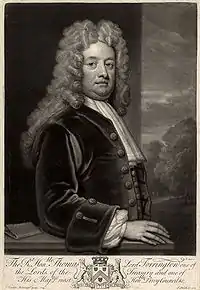 Newport returned to parliament at the 1715 general election, when he was returned unopposed as MP for (Much) Wenlock on the interest of his brother, Lord Bradford.[5] Also in 1715, he was appointed a Lord of the Treasury and held this office until 1718.[4] He vacated his seat at Wenlock in 1716, when he was raised to the Peerage of Great Britain as Baron Torrington, of Torrington, in the County of Devon on 20 June.[6] Newport was sworn of the Privy Council of Great Britain on 30 March 1717.[7] From March 1718, he served as one of the four Teller of the Exchequer until his death in 1719.[4]