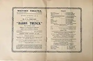 When Fred Whitney took over the lease of the Waldorf/Strand Theatre he chose to rename it the Whitney, opening his first season with Baron Trenck. The opening night audience were not enthusiastic with some booing during the third act[1][3] at what The Stage called the "weak, heavy and uninteresting" book. However, The Stage praised the music and the general performance with The Times writing that Walter Hyde performed "heroically".[1] Caroline Hatchard was "a bewitching Countess Lydia, at her wit's end over the constant dallying of her rapscallion lover, Trenck ... she acts interestingly, but her voice, admirably and so easily used by turns for comedy, tenderness and passion, would win its way anywhere."[4]