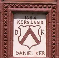 The arms of the Kers of Kersland were a chevron, charged with three stars or mollets. The motto was "Praise God". The coat of arms were displayed at Dalry church.[5]